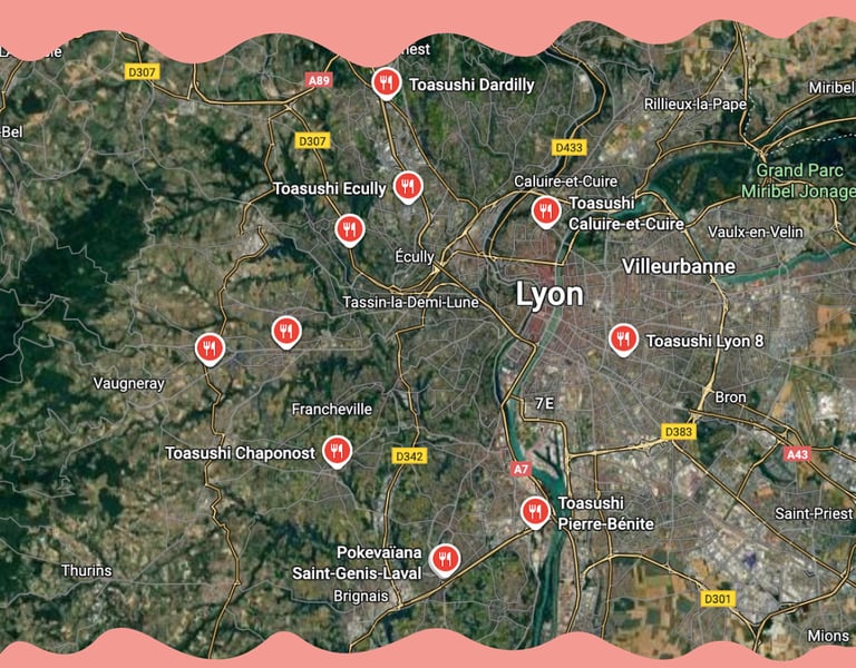 Toa Sushi Chaponost (ouverture juin 2023) et Toa Sushi Saint-Genis sont distants de 8,7 km, soit environ 15 minutes en voiture